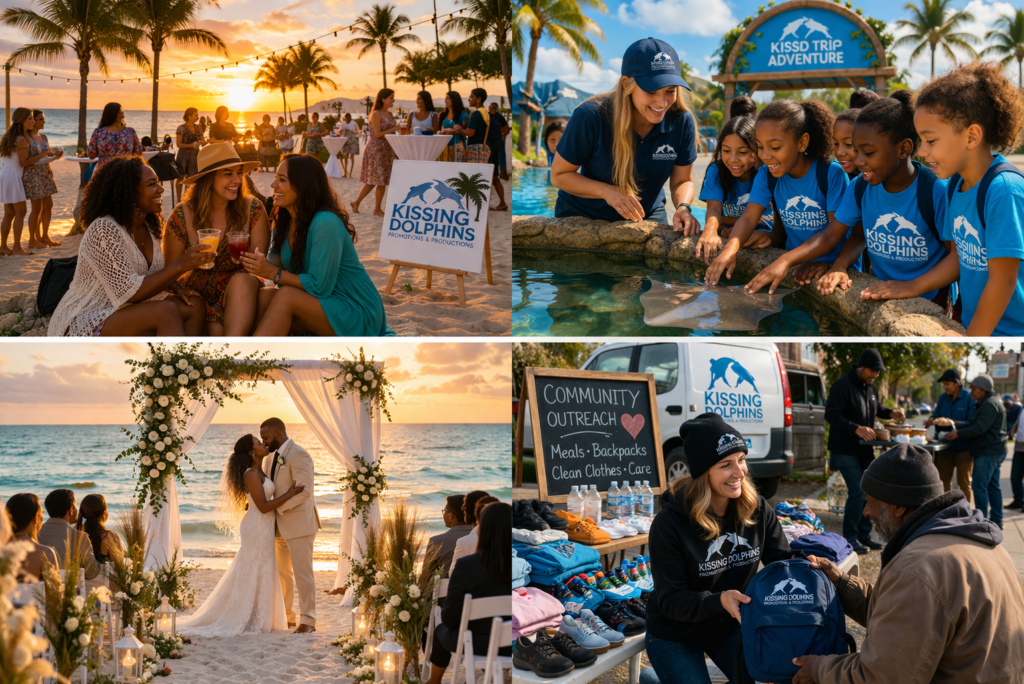 At kissing Dolphin, promotions, and productions LLC we go beyond traditional events/we create meaningful experiences that connect people, families, and communities. From singles events and weddings to educational field trips, beach, cleanups, and community outings, every experience we design is built to inspire connection, engagement, and lasting memories.